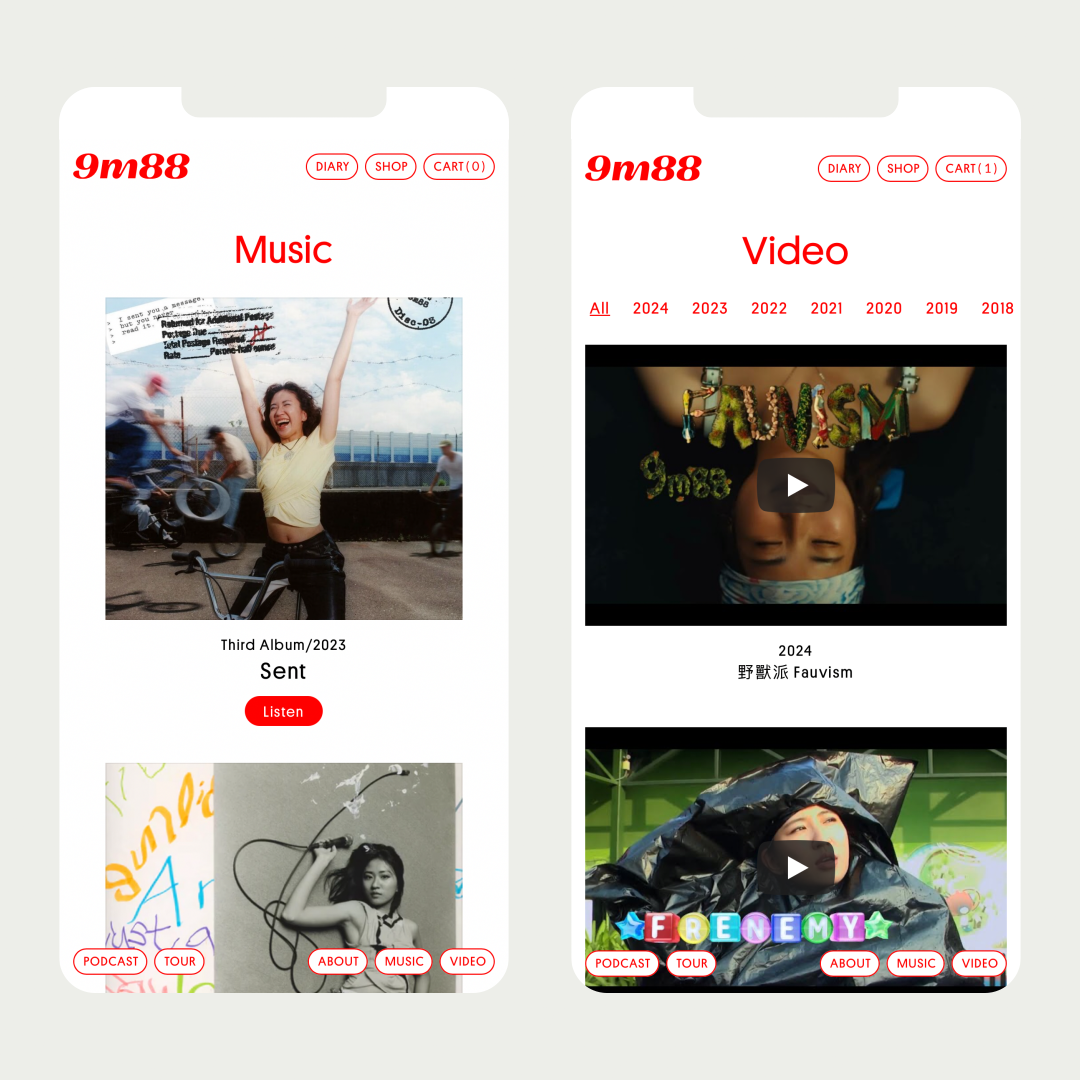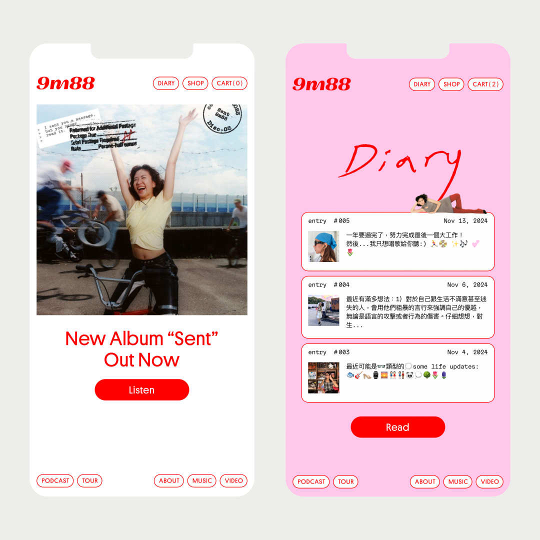 9m88 是亞洲爵士與靈魂樂的人氣歌手,我們為她重新設計了網站,將其打造成一個帶有復古氛圍的日記空間,喚起 Tumblr 和 MySpace 時期的記憶,當時藝術家們經常與粉絲分享長篇又個人的內容。網站以行動裝置優先設計,並整合 Shopify 平台,打造專屬的線上商店,提供限量周邊商品、CD 和黑膠唱片,讓樂迷更深入體驗她的音樂世界。